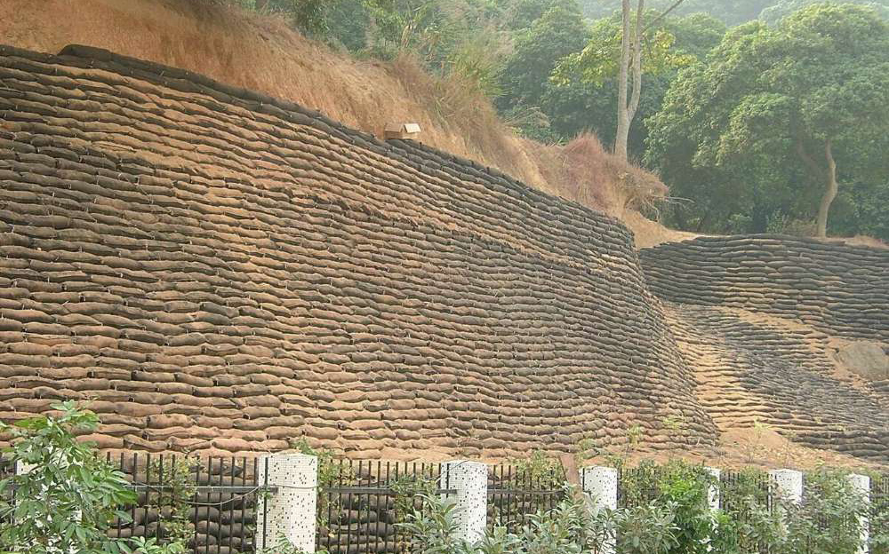 ①生態(tài)袋裝土?xí)r,考慮到后期坡體的綠化,選擇適合植物生長的土壤,并加入保水劑、肥料、中砂等摻合料。保證每袋裝土不宜超量(50kg/袋),每袋裝土均勻。避免袋體產(chǎn)生較大變形及夯實時產(chǎn)生漲破。