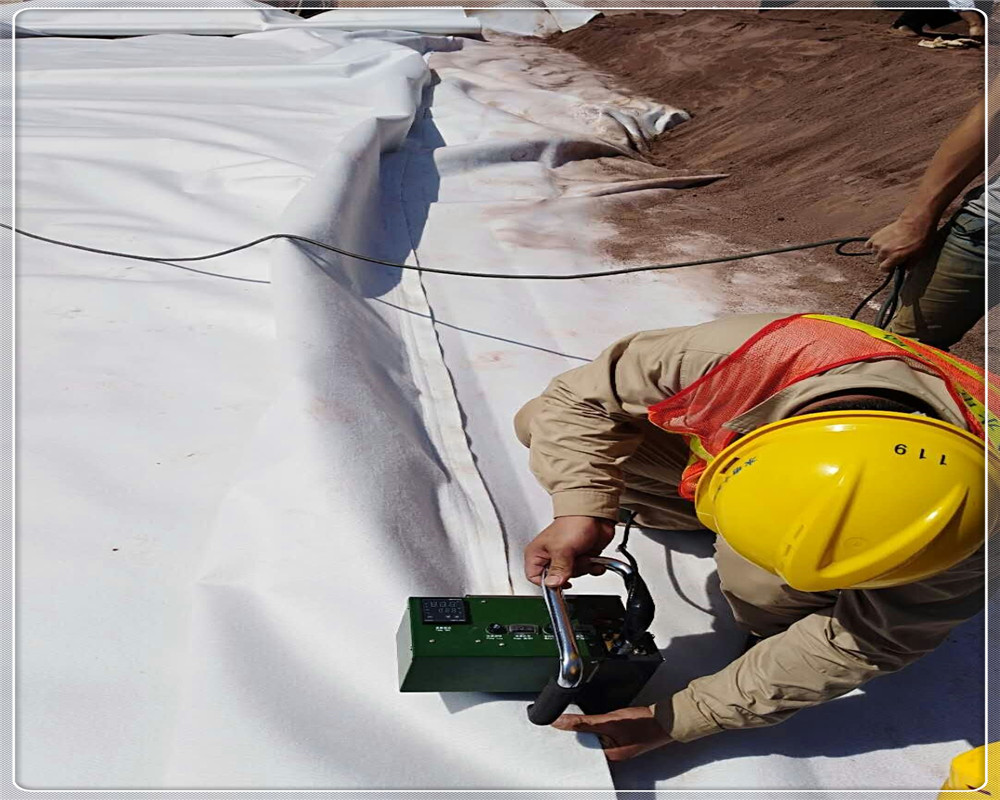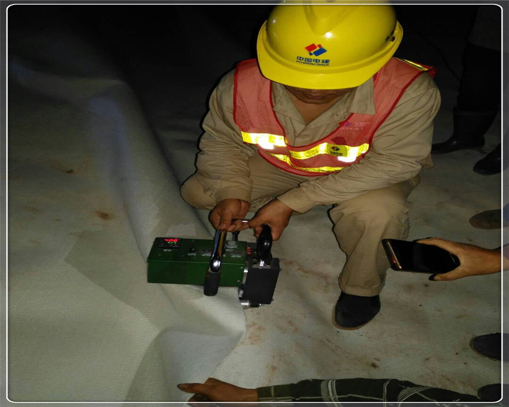 樞紐主要由復(fù)合土工膜堆石壩、溢洪道、引水發(fā)電系統(tǒng)、放空洞組成。復(fù)合土工膜堆石壩壩高85m,為高比例(達(dá)81%)軟巖填筑,軟巖填筑比例在同類型壩中世界之高。大壩防滲體采用復(fù)合土工膜防滲面板。土工膜之間的焊接和土工膜在錨帶部位的焊接,兩部位均采用熱風(fēng)粘合的方式。土工膜與土工膜之間的焊接采用全自動風(fēng)焊機進行,焊接帶的寬度為65mm,中間留有15mm的檢查氣孔,兩側(cè)各有25mm寬的粘合段。